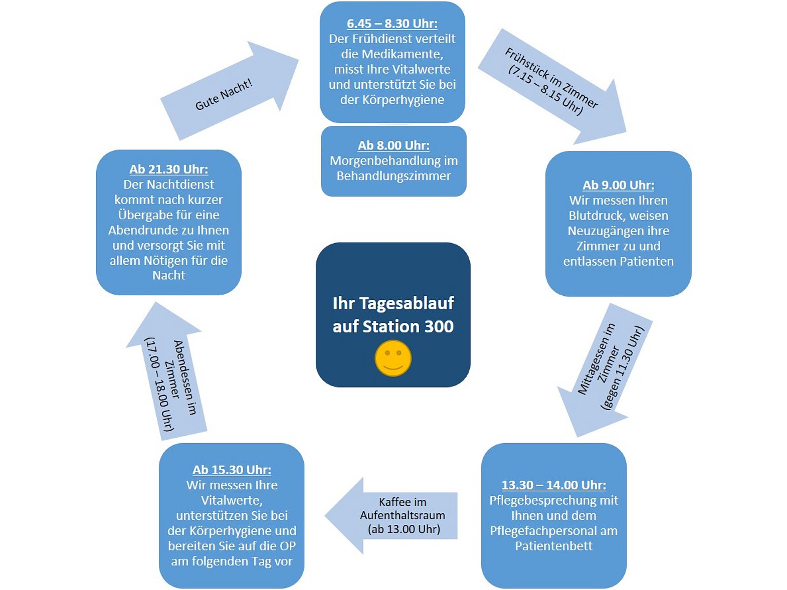 als Pflegeteam der Station möchten wir Sie herzlich begrüßen! Um Ihnen den Aufenthalt bei uns zu erleichtern, finden Sie hier einige wichtige Informationen. Bitte melden Sie sich beim Pflegestützpunkt ab, bevor Sie die Station verlassen und wieder an, wenn Sie zurückkommen!