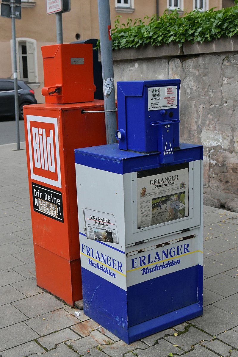 ... sind in den Zeitungsautomaten (BILD: 1,00 €; Erlanger Nachrichten: Mo. – Fr. 1,90 € bzw. Sa. 2,30 €; bitte passendes Kleingeld mitnehmen) ca. 20 m links vor dem Eingang zur HNO-Klinik und in der Cafeteria erhältlich, die Sie im UG gegenüber der Pforte finden. Zahlreiche Zeitungen und Zeitschriften können Sie außerdem unter dem Reiter „Unterhaltung“ --> „Magazine & Zeitungen“ direkt auf dem Patientencockpit lesen. Die dafür benötigte Karte können Sie am Automaten im EG (bei der stationären Aufnahme, vor Station 100) aufladen.